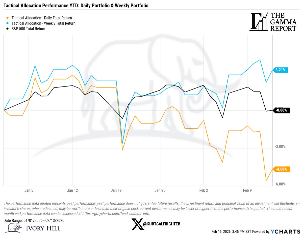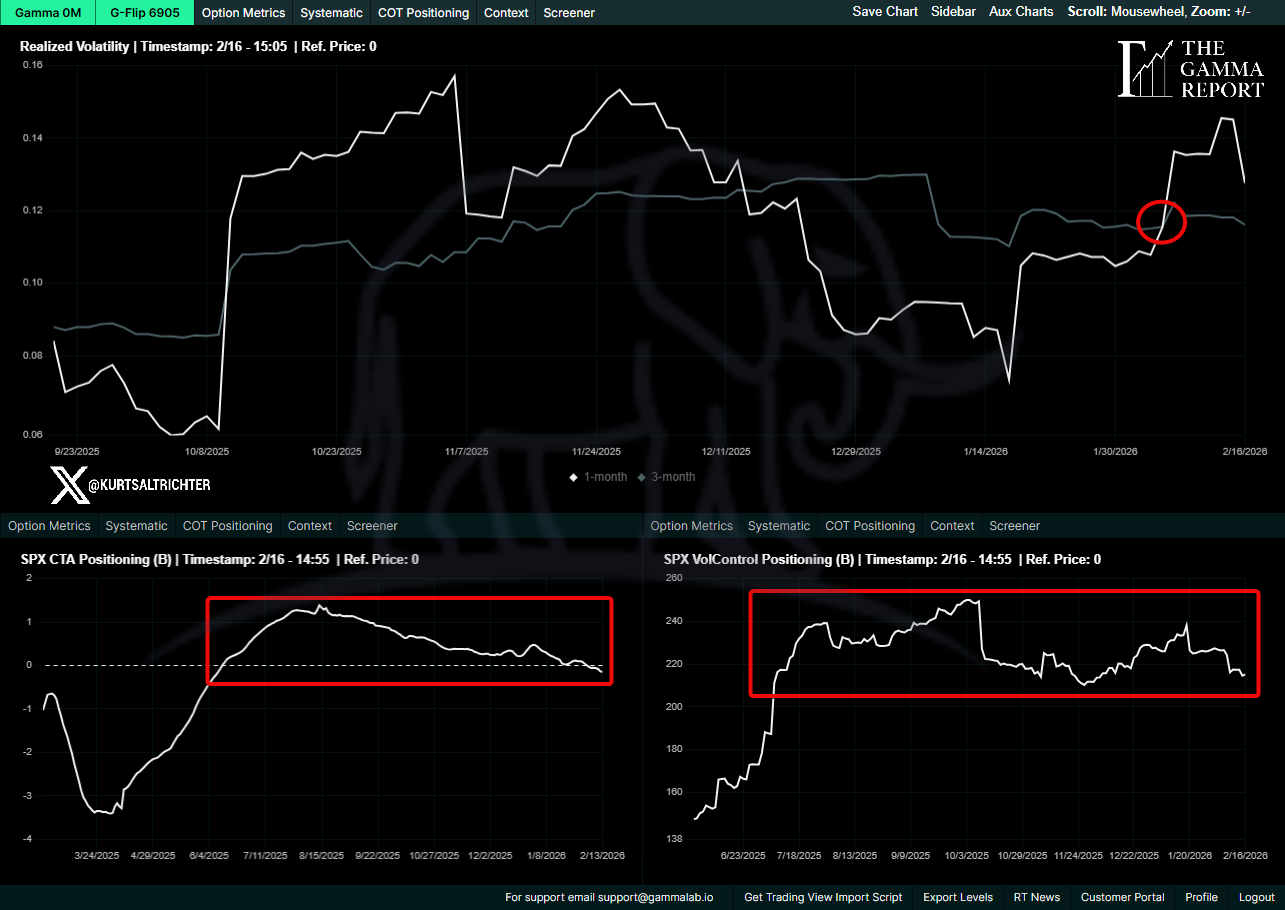 The directional trend matters more than the level. 30-day RV has risen from 10.05% on February 2 to 13.83% on February 13. That is a meaningful acceleration over a short window. Short-term volatility is still above long-term volatility, a condition that pressures vol-control funds to reduce exposure.
