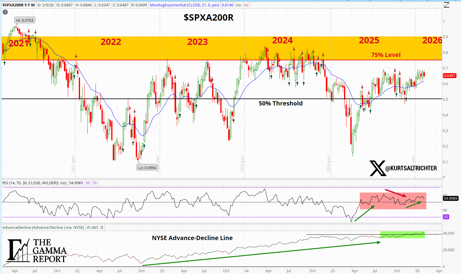 This is the lone constructive signal in the model right now. Participation has held up despite the pullback from the January highs. It means the decline over the past two weeks has not been broad enough to break the underlying structure of the trend.