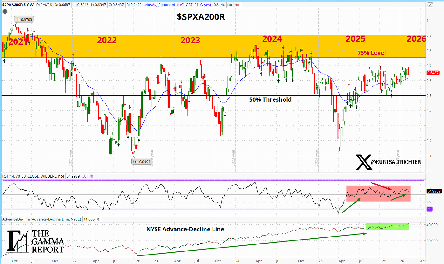 However, context matters. Breadth has been slowly fading from the mid-to-high 60s range it held through late January. A market that is pulling back with stable breadth is in a different position than a market pulling back with breadth diverging lower. Right now, breadth is providing a floor, not a ceiling.