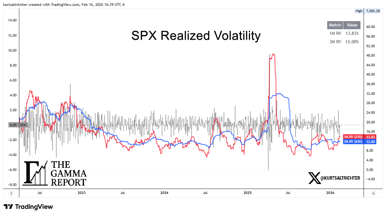 30-day realized volatility closed the week at 13.83%. 90-day realized volatility sits at 12.00%. Both are elevated relative to where they were at the start of the year, when the 30-day was printing near 8-9%.