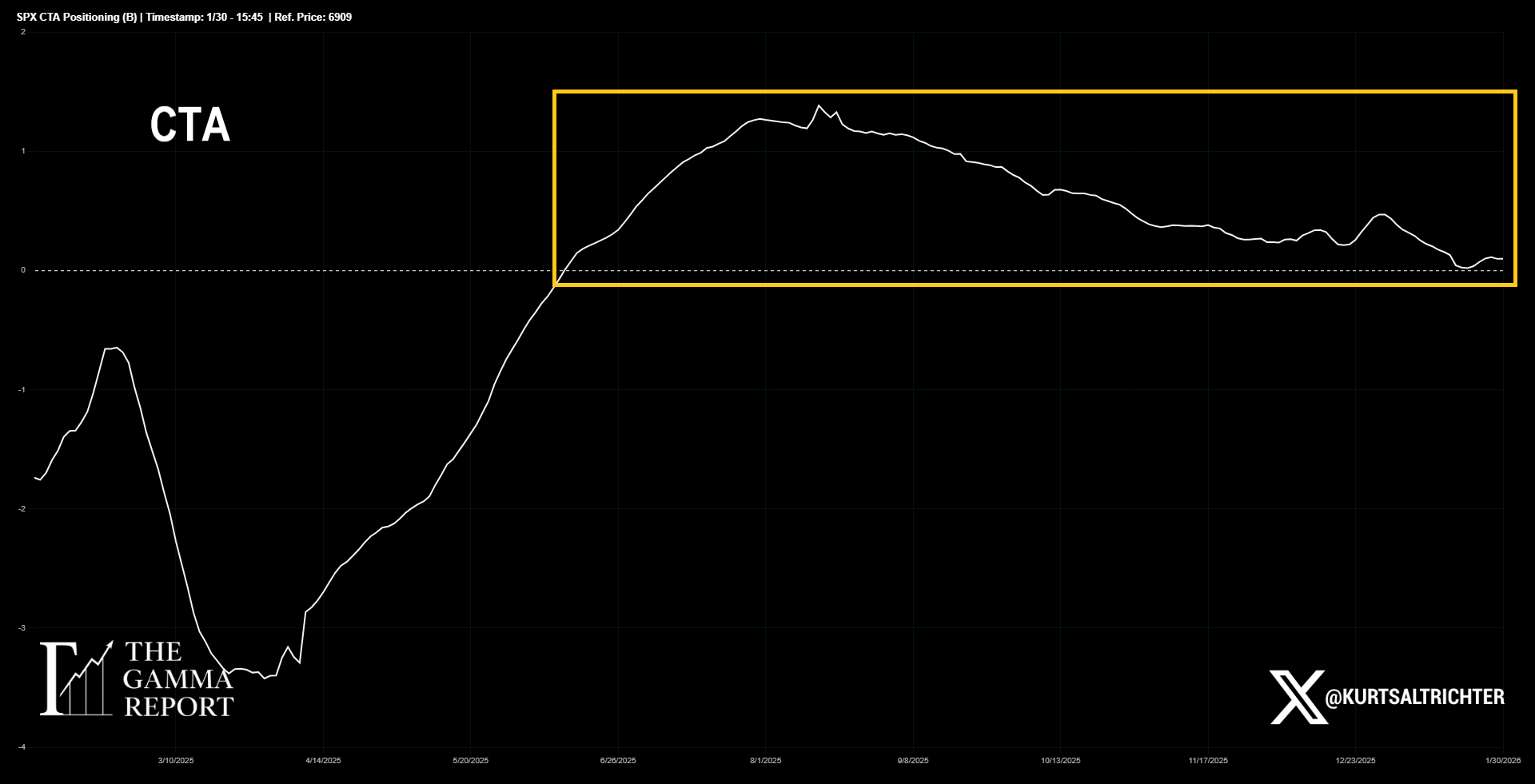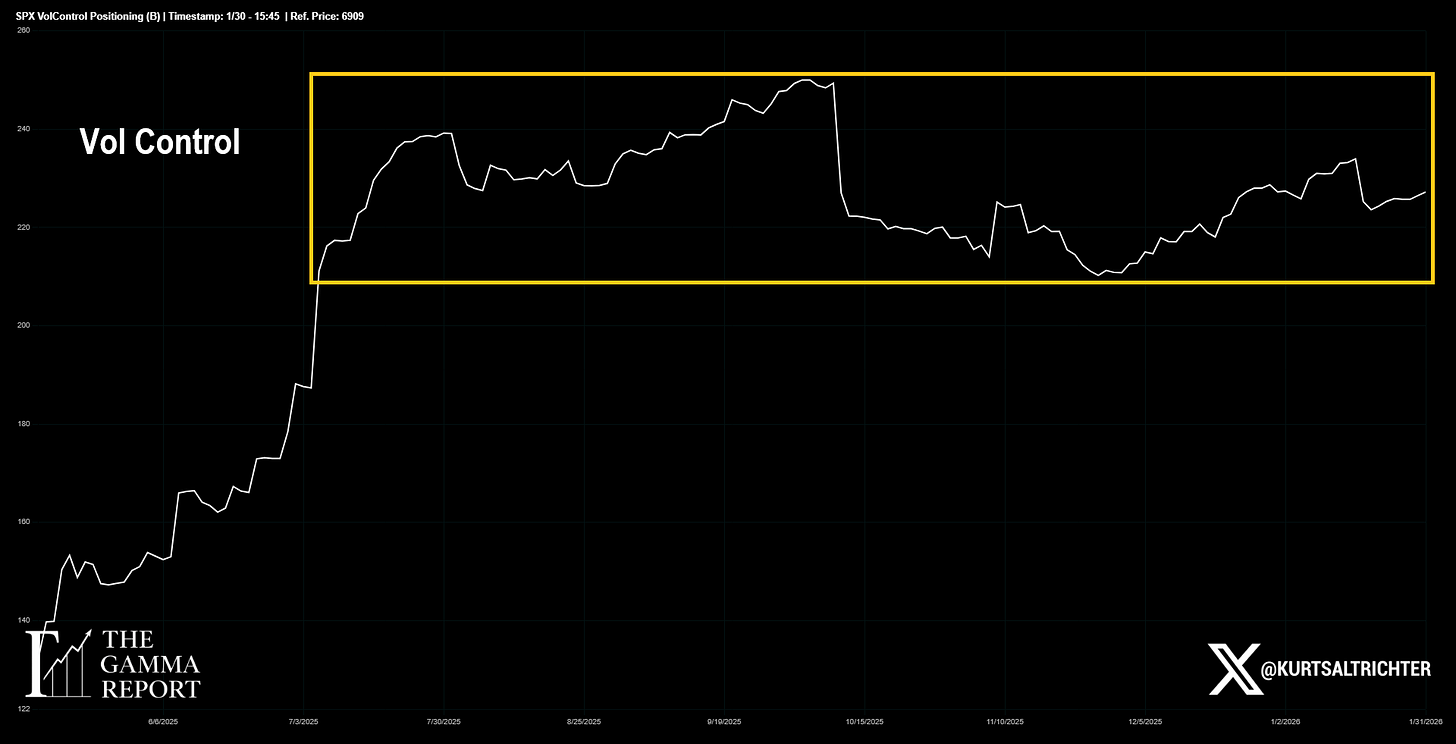 CTAs are not aggressively short, but they are no longer a source of incremental demand. When CTAs stop buying, and vol control stops expanding, markets tend to compress. That is exactly what we are seeing now.