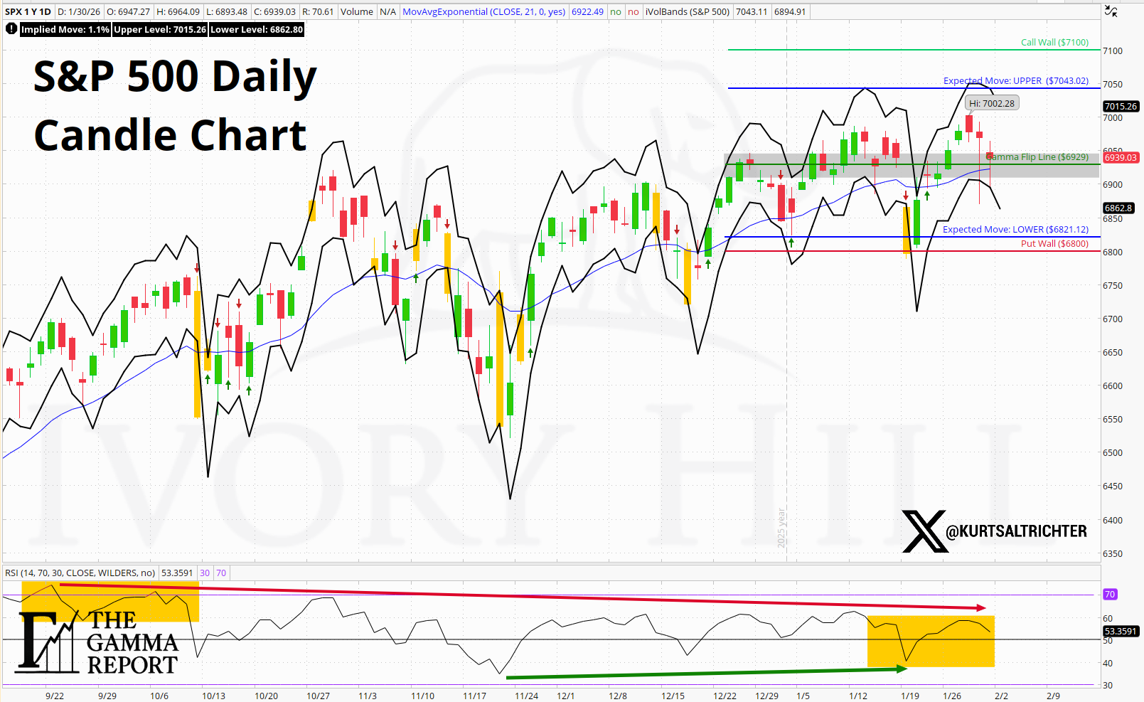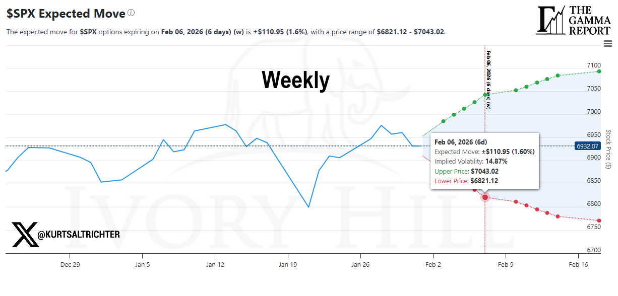 SPX briefly touched 7,000 for the first time and bounced right off of last week’s upper expected move, but the week ended with volatility reasserting itself. That combination, record prices paired with growing instability under the hood, reinforces the need for restraint and discipline as we head into February.