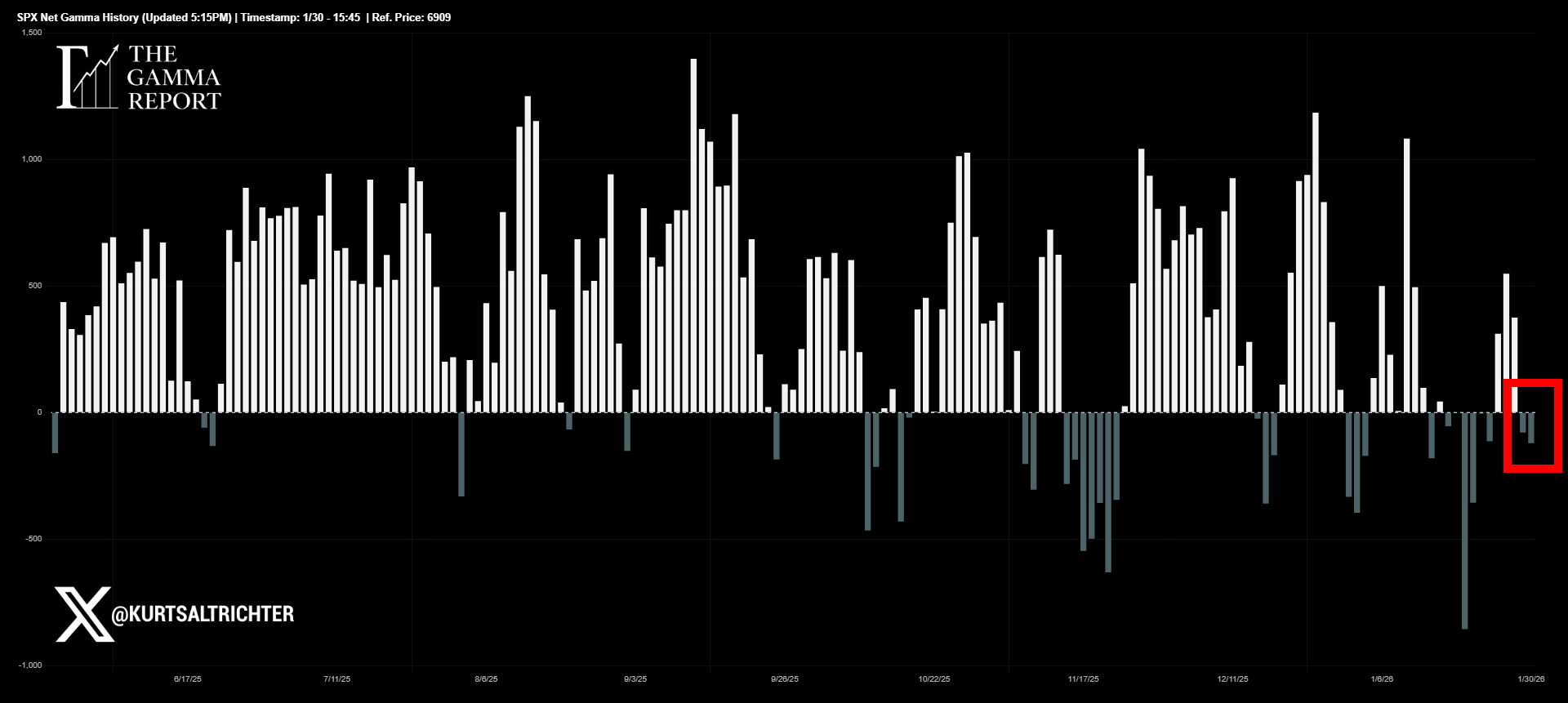Dealer positioning slipped back into negative gamma late last week. That shift changes how liquidity behaves across the index.