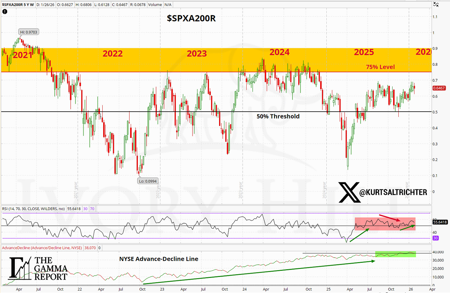 Breadth remains the most important volatility suppressor in this market. Roughly 65% of S&P 500 stocks remain above their 200-day moving average, which has helped keep downside contained despite negative gamma and softer flows.