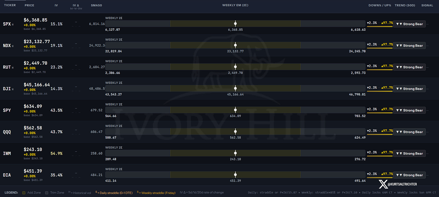 JOLTS Tuesday. ISM Wednesday. Payrolls Friday. In negative gamma, whatever the tape delivers gets amplified, in both directions. So your job is to monitor the market, and as long as it stays within the weekly expected move box, you have no reason to allow your emotions to get the best of you.