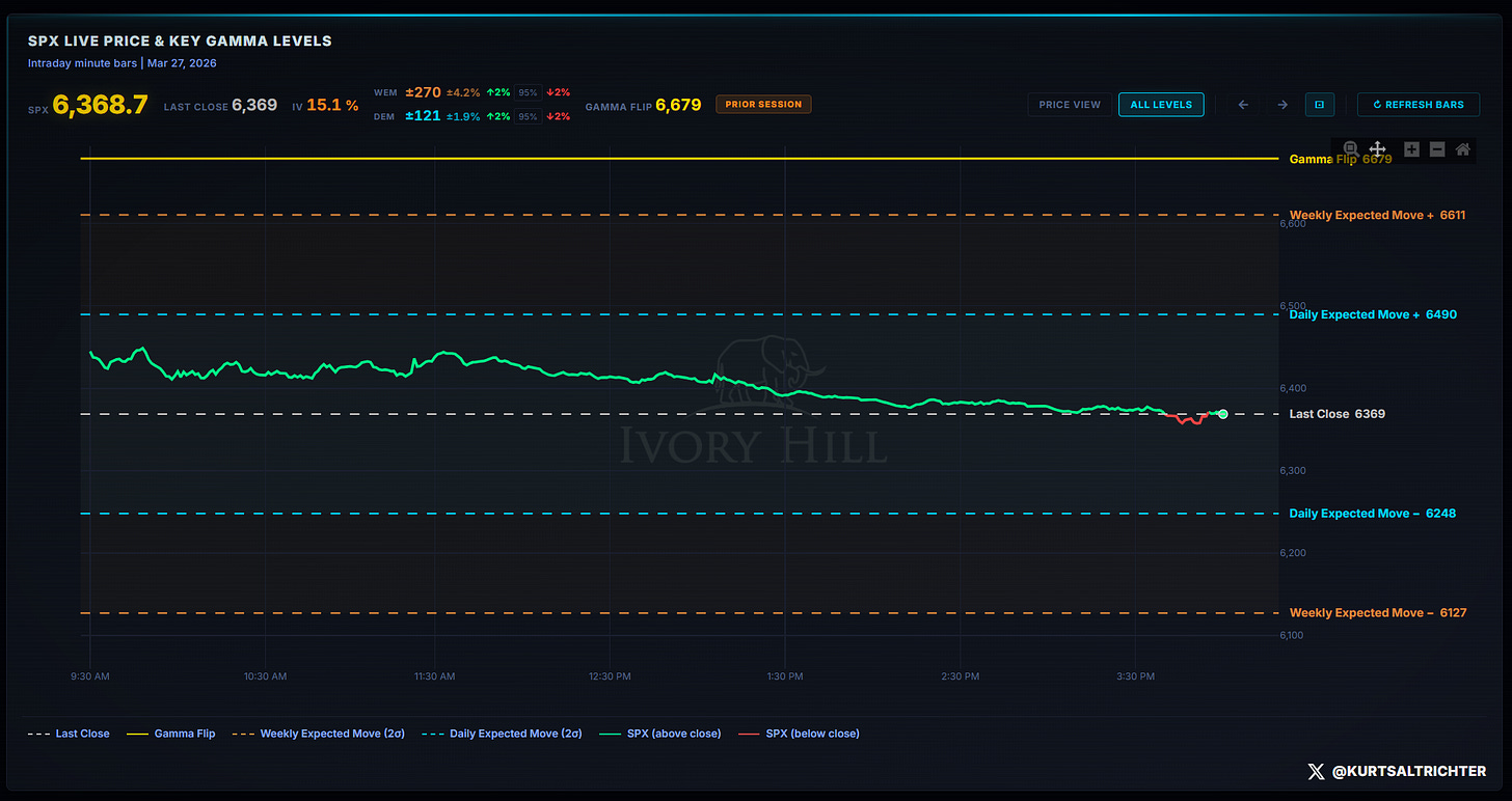The S&P 500 is still deep in negative gamma, closing Friday at 6,369. The flip line is at 6,678. That is 309 points between here and a market that starts behaving better. The “gamma hole” is getting deeper.
