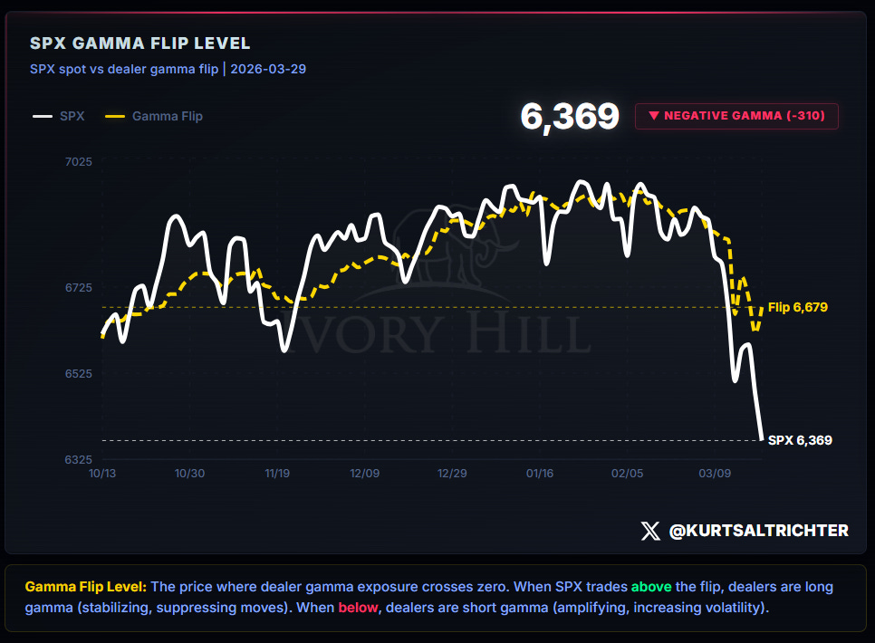 The options market has a specific price level where dealer behavior flips. Above that level, dealers naturally buy when the market dips and sell when it rallies, which keeps things calm and contained. Below it, they do the opposite. They sell when the market drops and buy when it bounces. That means every move gets bigger than it otherwise would be. Right now, we are below that level and have been for weeks. Dealers are not stabilizing this market. They are amplifying it.