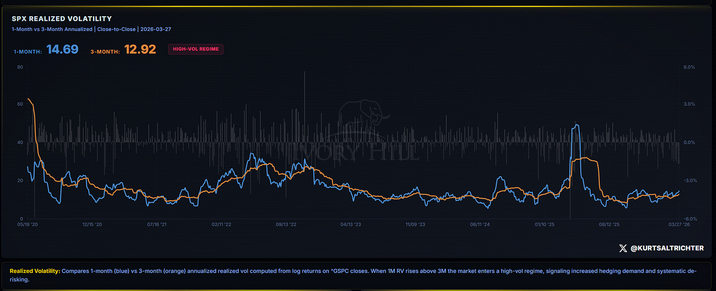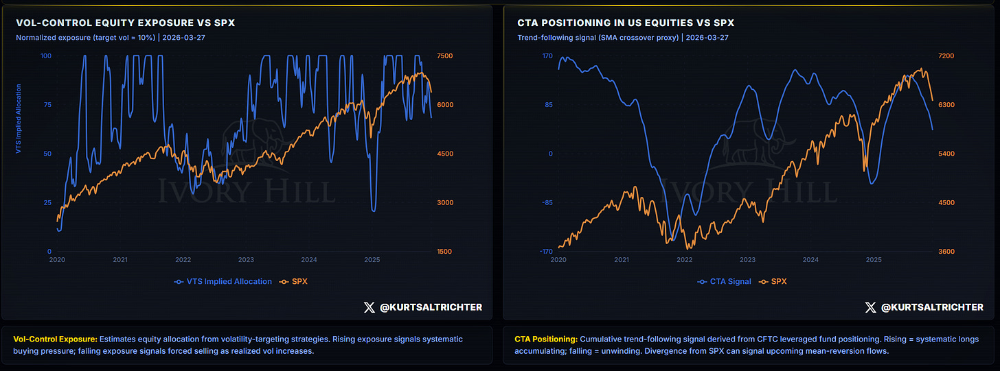 Short-term volatility (blue line) is running hotter than long-term volatility (orange line). That is important because a specific group of large institutional funds, called vol-control funds, is required by their own rules to automatically sell their stock holdings when short-term volatility exceeds long-term volatility. They are not making a judgment call on the economy or earnings. They are following a computer program. And right now that formula is telling them to sell. Until short-term volatility cools back down below the long-term reading and stays there, those funds keep reducing exposure. That is a persistent mechanical headwind for this market.