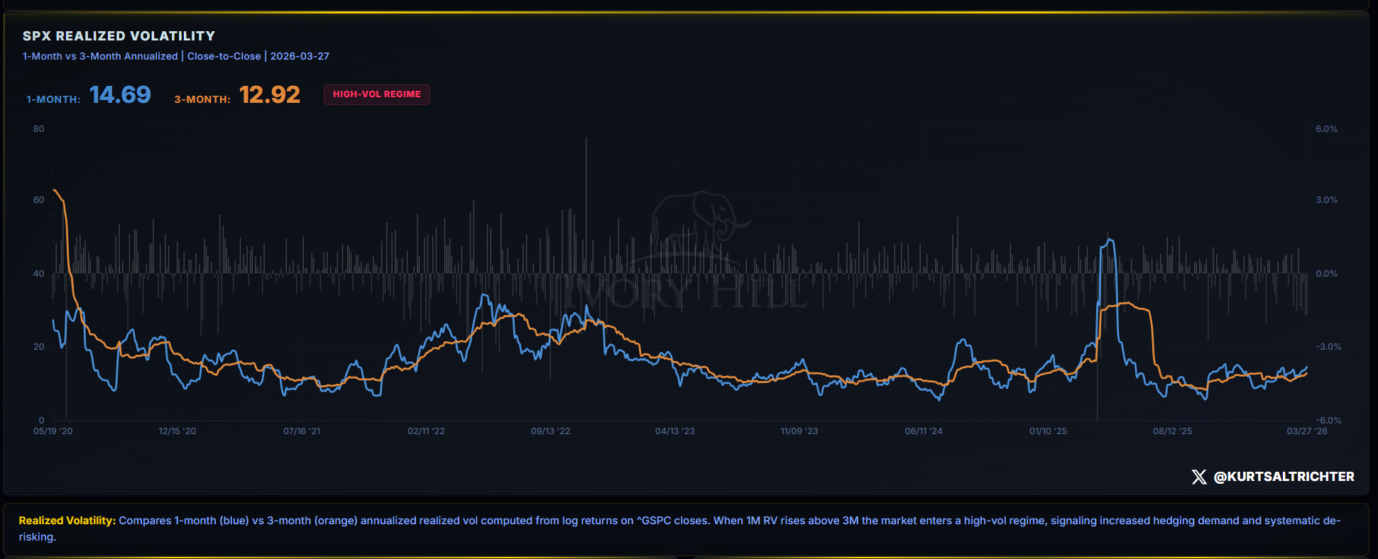 1-month RV: 14.69. 3-month RV: 12.92. HIGH-VOL REGIME.
