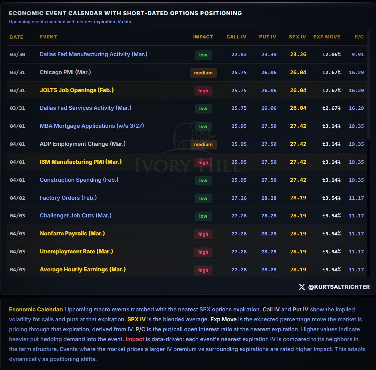 ISM Manufacturing Wednesday. Every month, purchasing managers at American factories get asked one simple question: Is business getting better or getting worse right now? These are the people who are actually placing large orders, managing large inventories, and deciding whether to ramp up or slow down their spending. We are talking about the purchasing manager at a mid-size auto parts manufacturer who controls $50 to $100 million in annual spending, or the equivalent at a Caterpillar or 3M where that number runs into the billions. When they say things are getting worse, they are already slowing down orders, stretching out delivery timelines, and telling suppliers to hold shipments. That is real economic activity stopping in real time. And when that happens, factories produce less, order fewer raw materials, and start cutting worker hours or headcount. That feeds directly back into the jobs market, corporate profits, and eventually your 401k balance. Expectations are for a reading around 49.5, which means the people running American factories still think things are getting worse. The options market is pricing a bigger move around ISM than JOLTS. Wednesday has more potential to move prices than Tuesday.