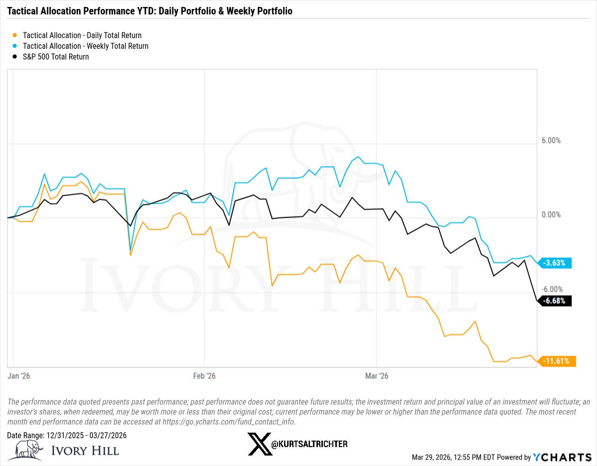 Down 3.63% against an index that is down 6.68% in a pretty volatile start to the year. The defensive posture is doing its job. The model is fully invested at all times to reflect market structure.