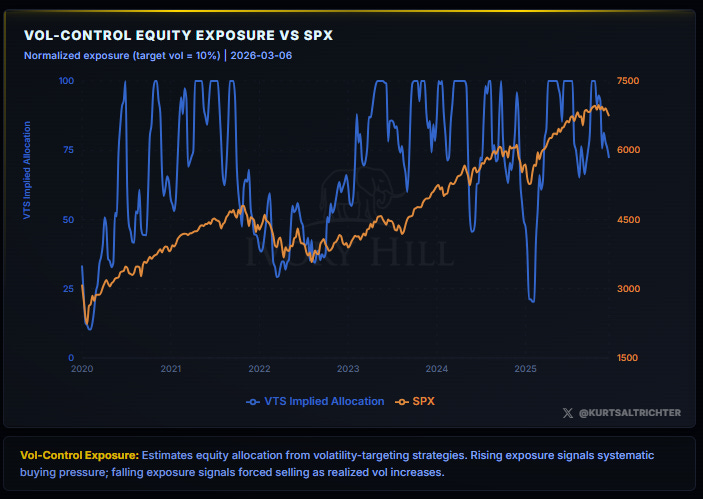 Look at the VTS implied allocation chart. Compare January to today. That decline is algorithmic. Mechanical. It does not stop until realized vol flattens. Realized vol has not flattened.