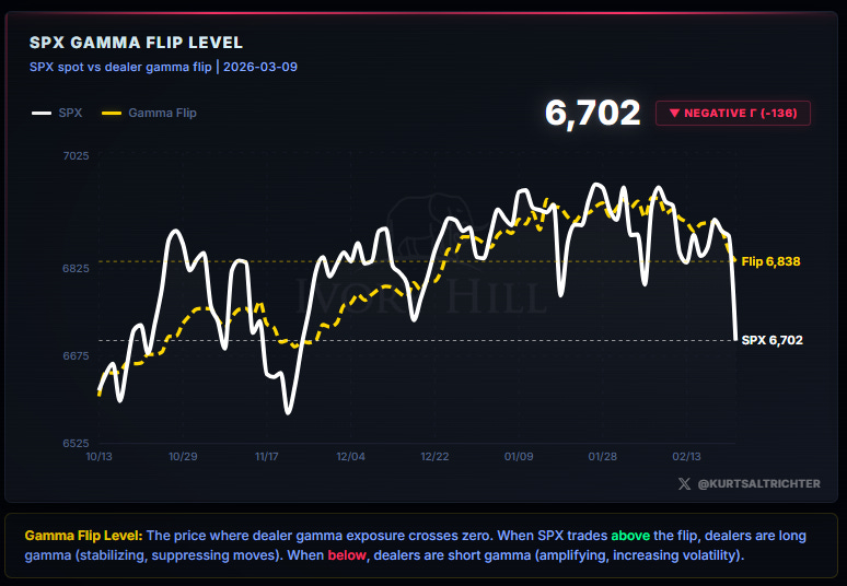 SPX is at 6,702. The gamma flip is at 6,859. That is 157 points of separation.