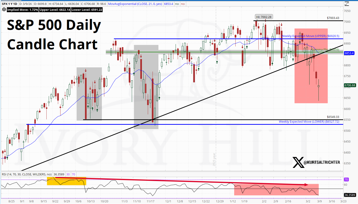 The weekly expected move for this week is 6,920 upper and 6,527 lower. The implied move is 1.72%. The market has room to move in either direction. But the structure says the path of least resistance is not up.