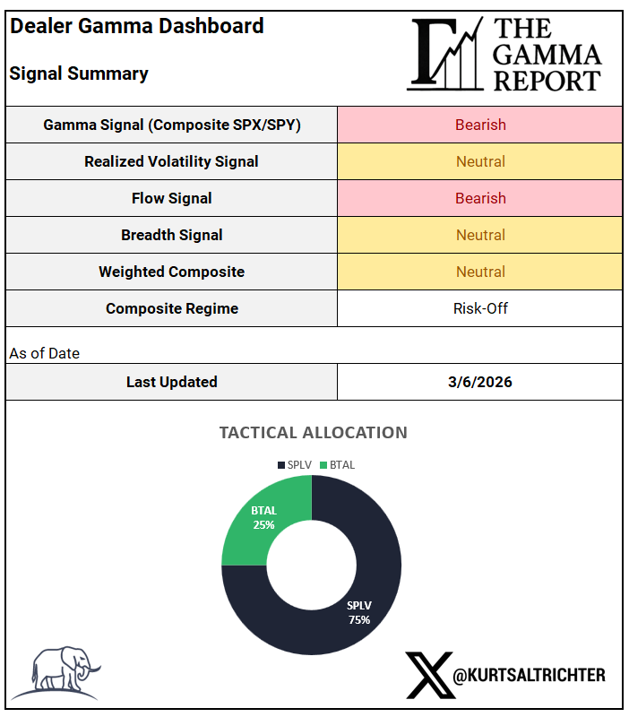 Two Bearish. Two Neutral. Composite Neutral. Regime Risk-Off. Allocation 75% SPLV / 25% BTAL.