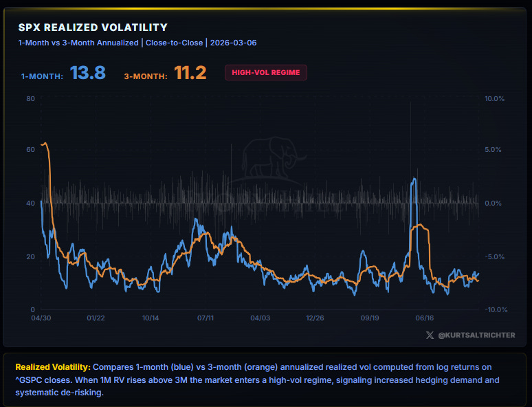 What changes it: SPX reclaims 6,838 and holds it. Realized vol flattens, and the spread starts compressing. Breadth recovers above 60%. All three need to move in the right direction. Right now, none of them are.