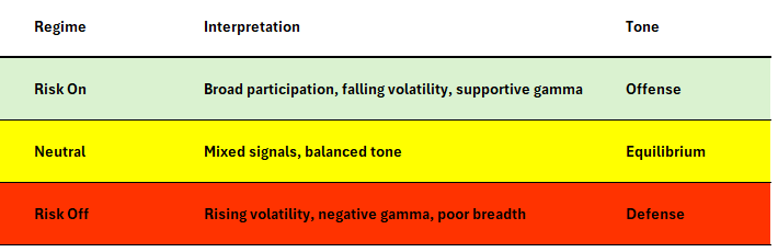 Each signal in the model works together to tell a story about the market’s internal health. Gamma sets the tone, volatility confirms it, systematic flows reinforce it, and breadth validates it.