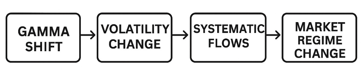 Realized volatility connects gamma and flows. When gamma turns negative, volatility rises. When volatility rises, systematic funds reduce exposure. This feedback loop drives much of the market’s short-term movement.