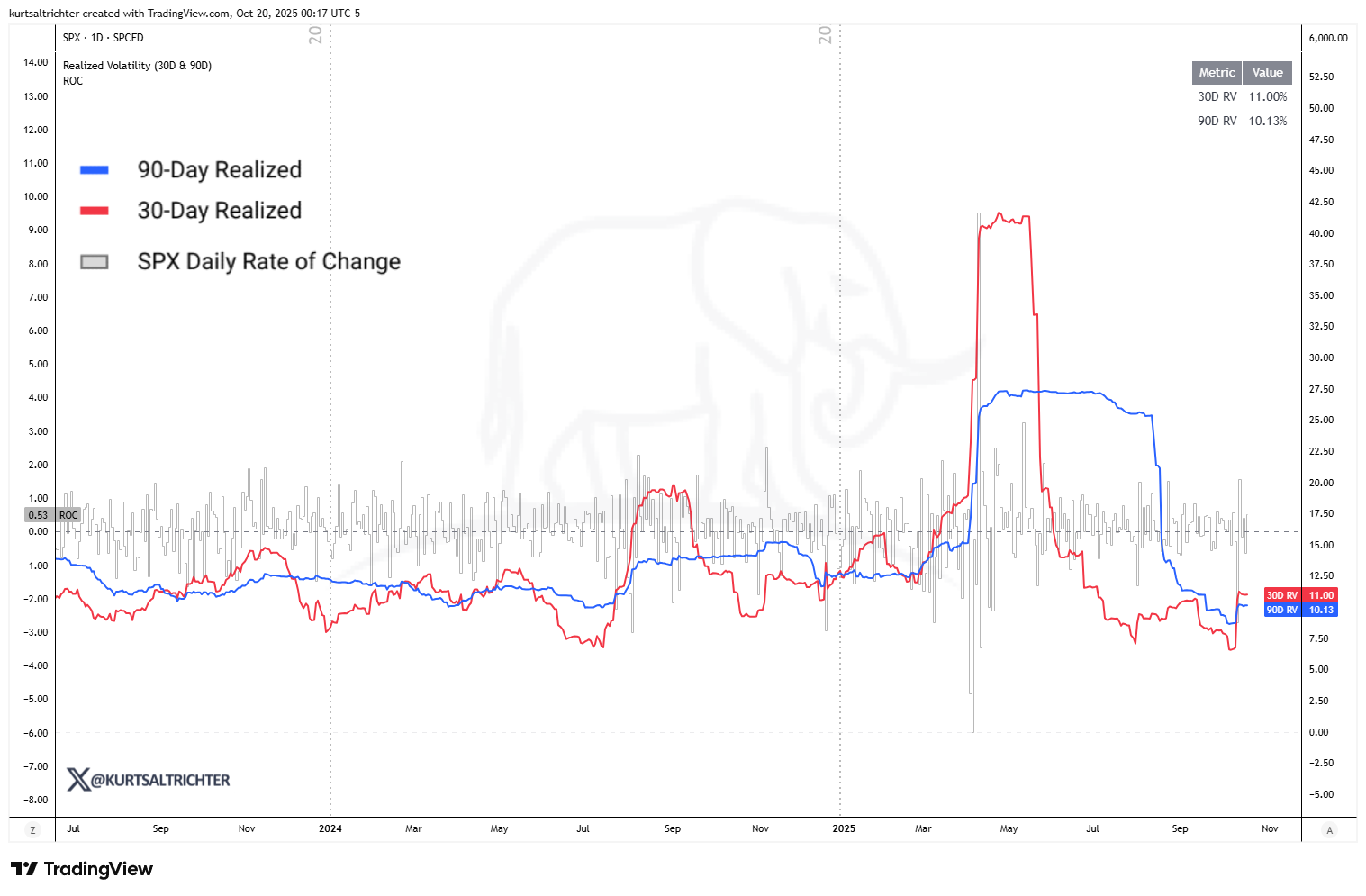 When the 30-day line rises above the 90-day line, short-term volatility is increasing faster than long-term volatility. This signals stress and instability in the market.