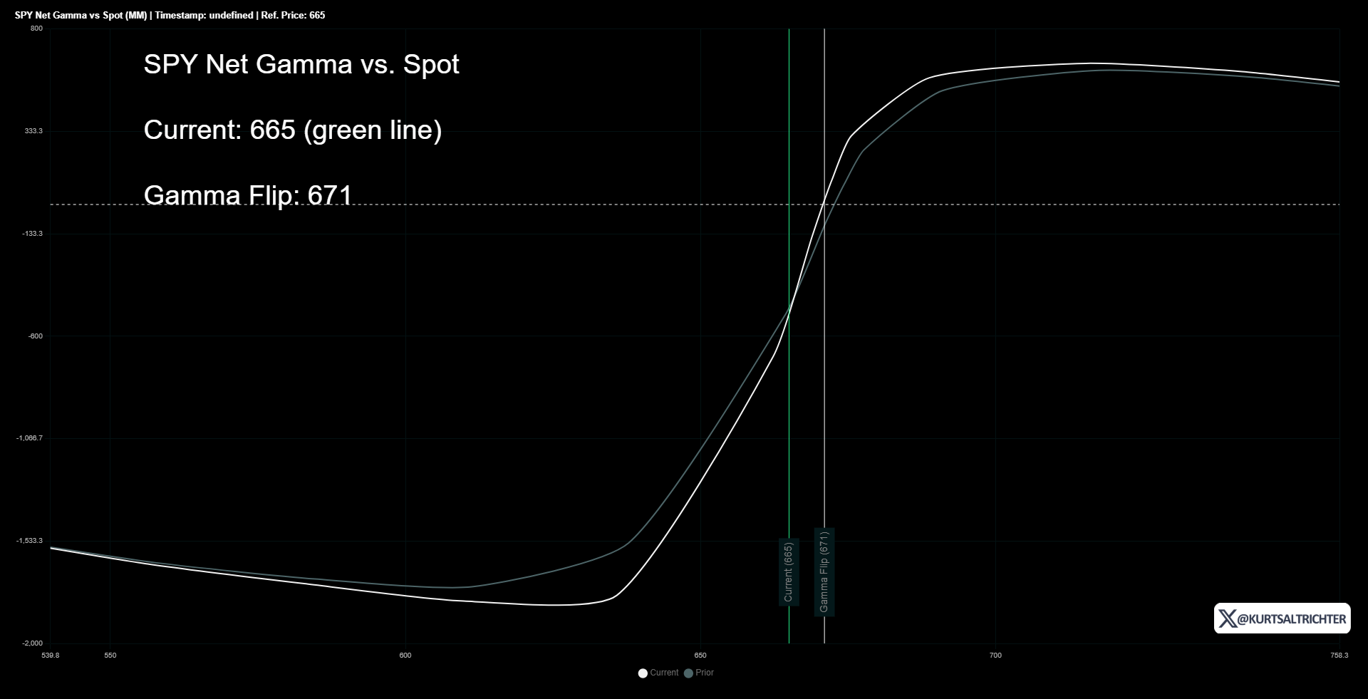 When the spot price (green line) is left of the gamma flip point (white line), dealers are in a negative gamma regime. When the green line is to the right, they are in a positive gamma regime.