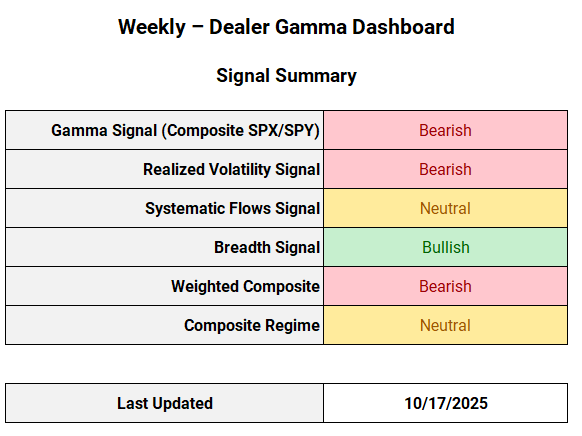 When three or more signals point in the same direction, conviction increases. Gamma and volatility drive short-term regime shifts, while flows and breadth confirm whether those moves are sustainable.