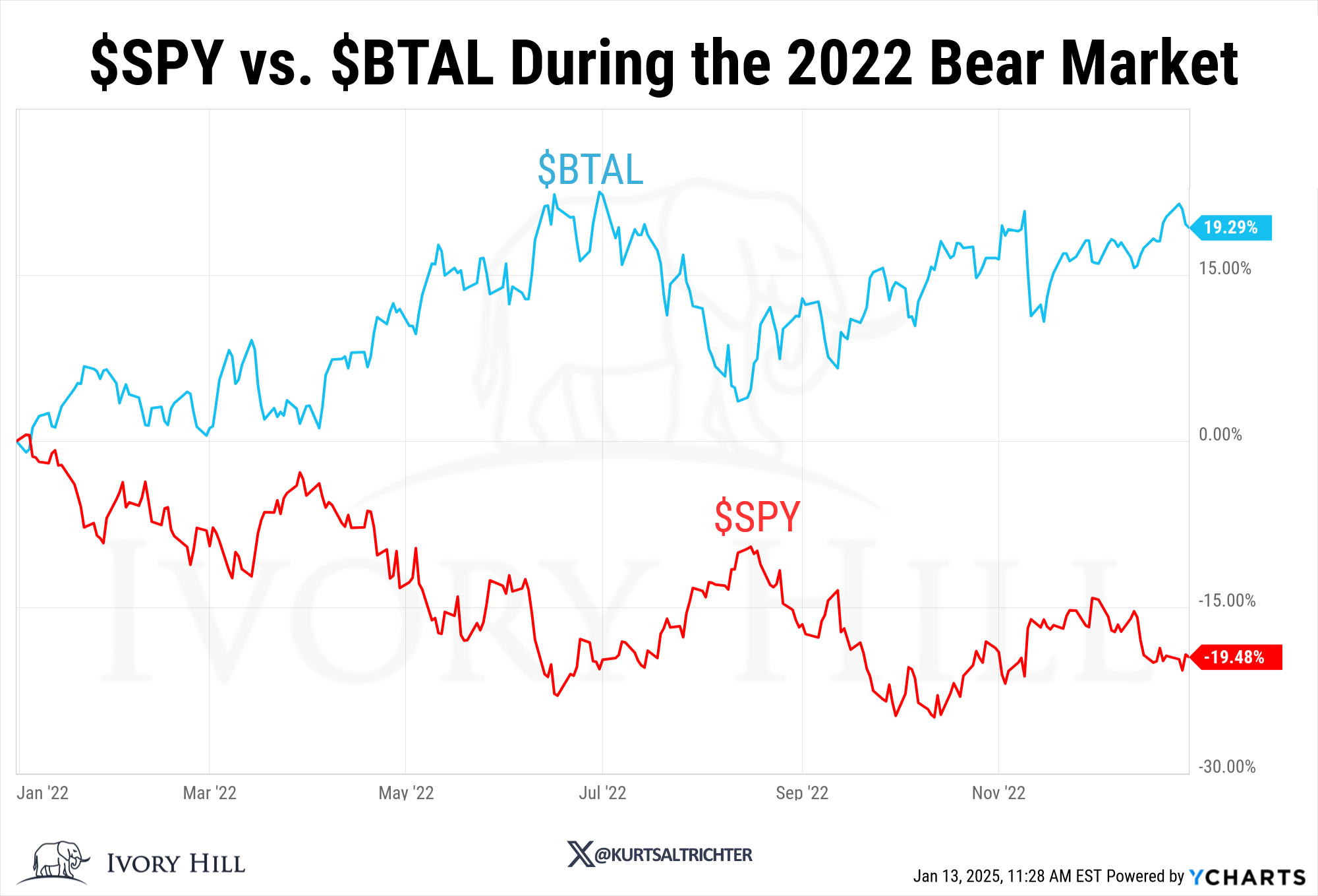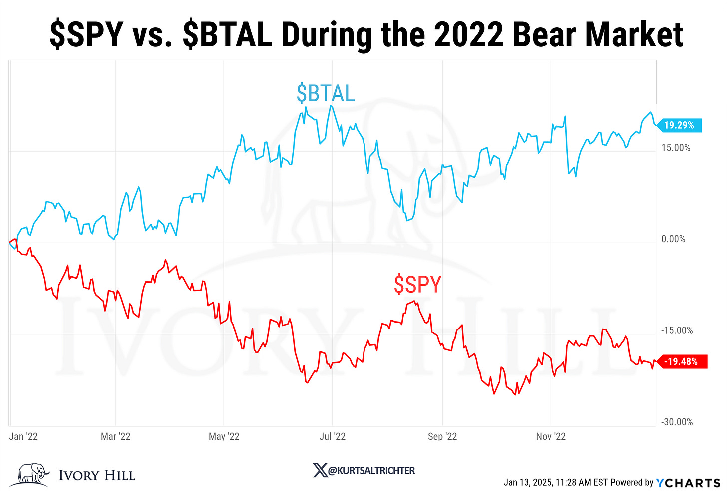 At the end of last week, we increased our exposure to BTAL as a hedge ahead of today’s CPI report. BTAL is one of my favorite ETFs to use during uncertainty. BTAL’s objective is to provide negative beta exposure to the US equity market by taking long positions in low-beta stocks and short positions in high-beta stocks, capturing the spread return between the two. I call it the “volatility dimmer switch.” As volatility rises, I increase exposure to BTAL to suppress portfolio volatility. This also allows us to benefit from the downside without taking an aggressive short position, only to get our face ripped off when the market rebounds.