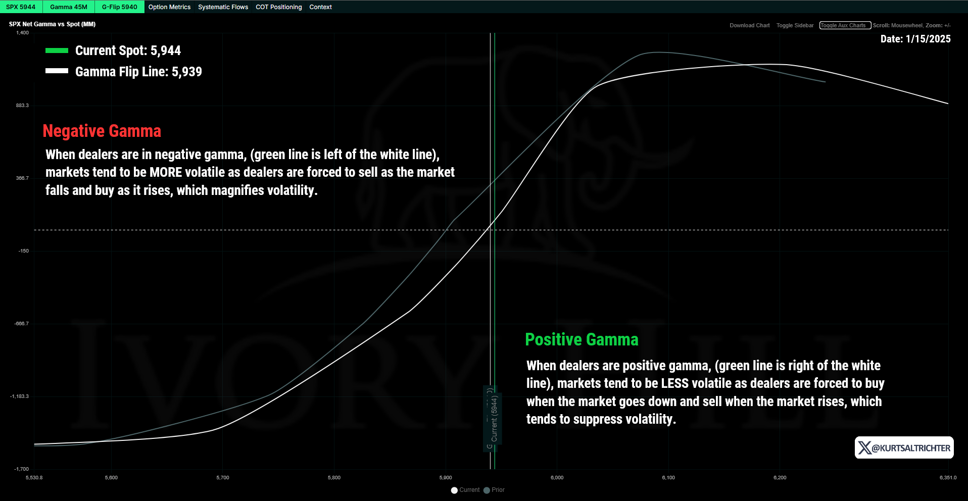 Dealers narrowly closed in positive gamma territory today at +5. If the SPX remains above the flip line at 5,939, we can expect reduced volatility in the days ahead. For more details on dealer gamma, check out last week’s report.