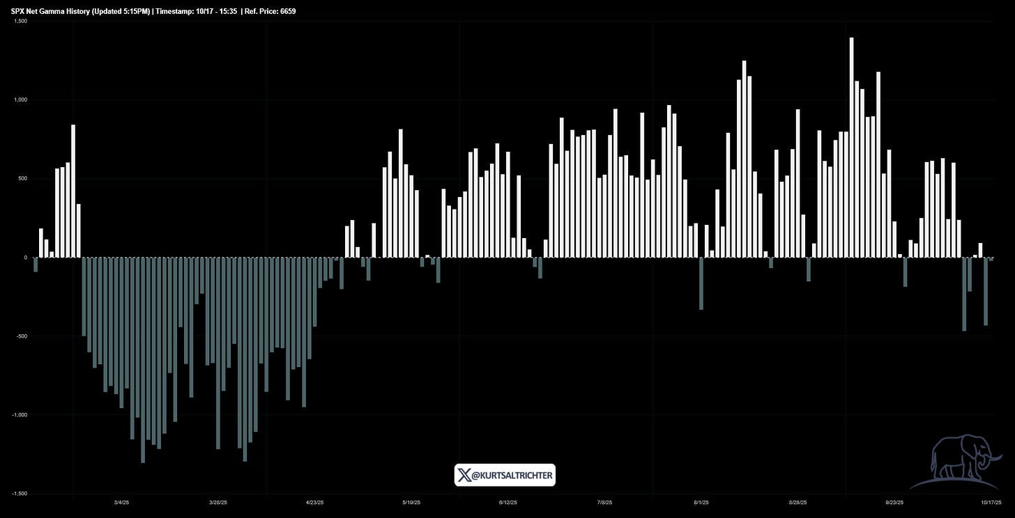 Historically, periods of sustained negative gamma have preceded both sharp downside accelerations and short-lived relief rallies, depending on the direction of the next breakout. With the market compressed inside last week’s range, this setup effectively loads the spring. A break above 6,700 would trigger a wave of dealer buying and suppress volatility, while a move below 6,520 would likely unleash another round of volatility expansion as hedging flows turn pro-cyclical to the downside.