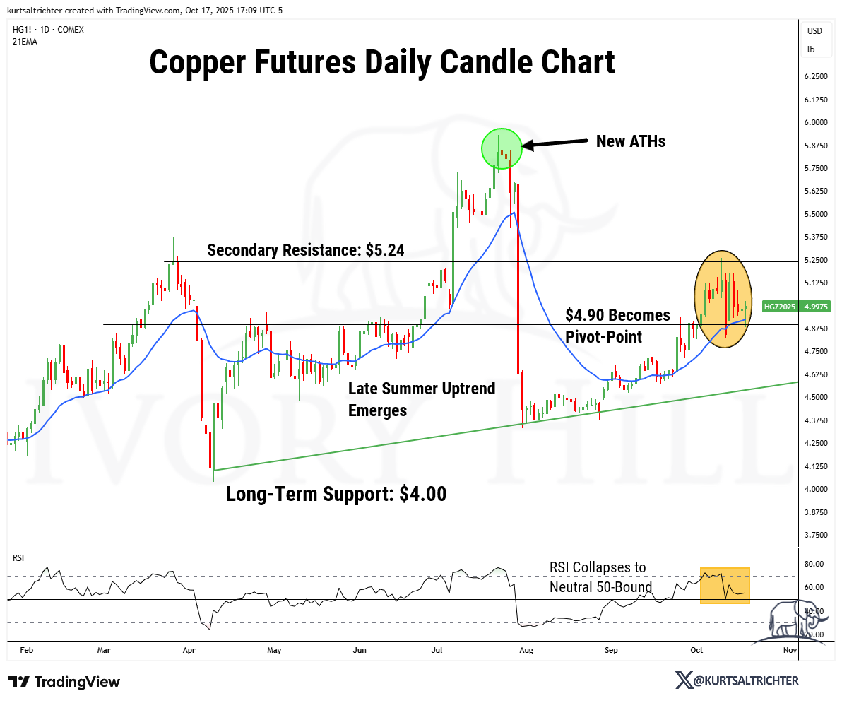 If you’re looking to buy gold right now, it may be wiser to consider copper instead. Gold has already made its move, gaining more than 60% this year, and is now trading well above trend with both momentum and sentiment stretched. While gold could stay elevated for a lot longer, a pullback looks increasingly likely, and new buyers face poor risk-reward at current levels. Copper, in contrast, has quietly reset. It recently retested its $4.90 pivot, is holding firm above long-term support, and its RSI has returned to neutral, suggesting it’s building a healthier base for the next leg higher.