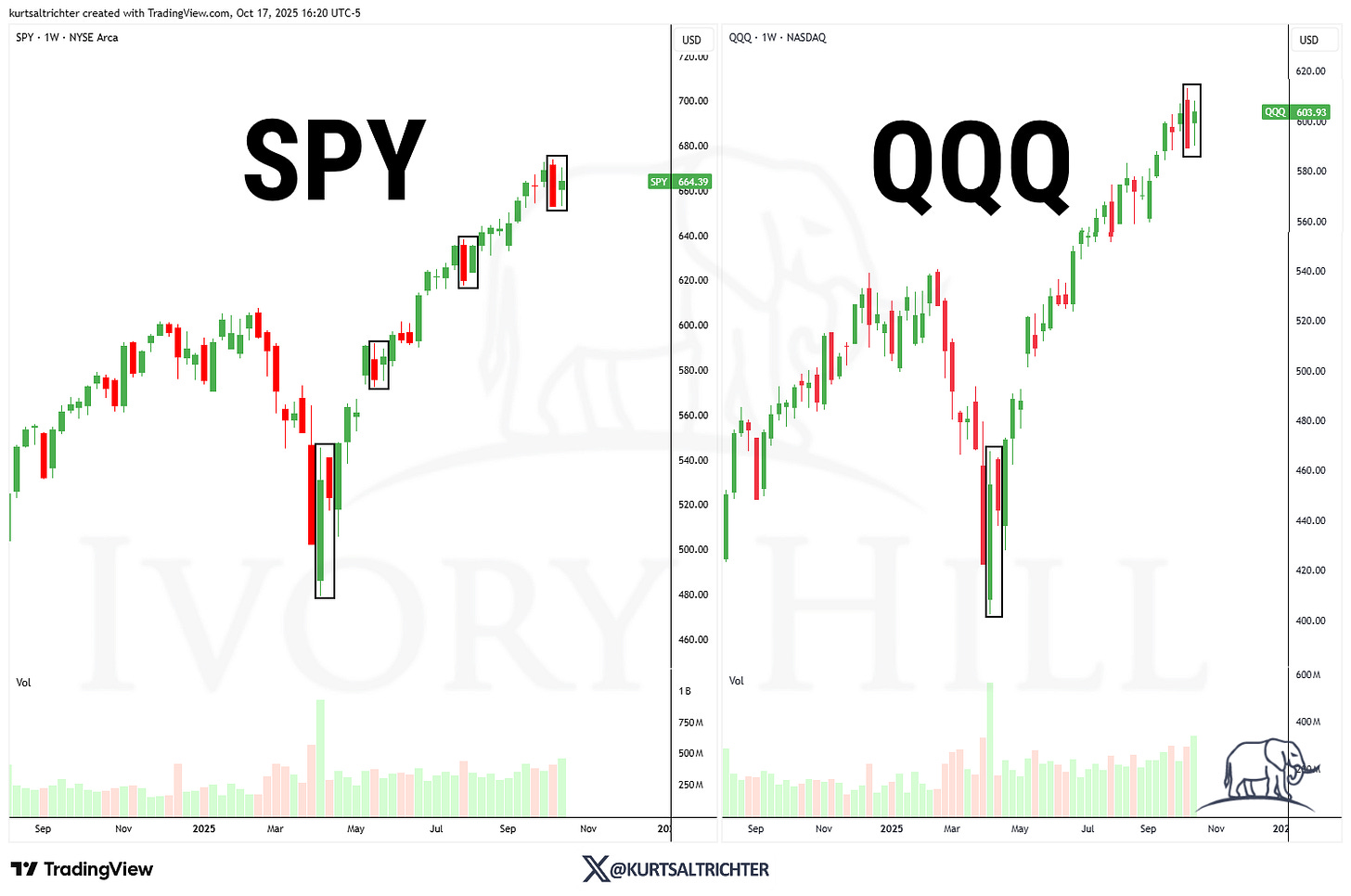 Both SPY and QQQ printed inside weeks, signaling a temporary pause in momentum after a volatile stretch. Inside weeks form when price trades entirely within the previous week’s range, often preceding sharp directional moves as volatility compresses. This reflects hesitation from both buyers and sellers following the CPI and tariff shocks, with markets now waiting for confirmation. A breakout above last week’s highs would suggest renewed risk appetite and likely bring systematic buyers back into the market. A break below the lows would confirm that the recent bounce was corrective, not durable, and could trigger another round of selling, especially in crowded tech positions. In short, the next decisive move out of this compression will likely define how equities trade into November.