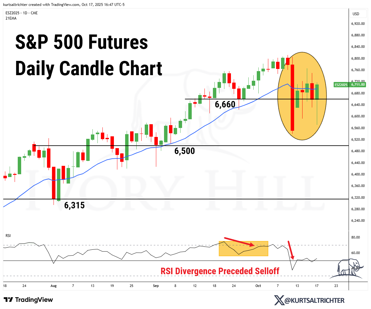 The S&P 500 held above 6,540, the lower boundary of its September consolidation range, maintaining structural support despite heightened volatility. The recent selloff was preceded by clear RSI divergence, indicating weakening momentum before the selloff. While breadth deteriorated, selling pressure never turned into broad liquidation. RSI briefly dipped below 30 before rebounding, which signals exhaustion rather than a full trend reversal. For now, 6,500 remains a key line of defense, while 6,700 marks the short-term resistance level that bulls need to reclaim to confirm stabilization.