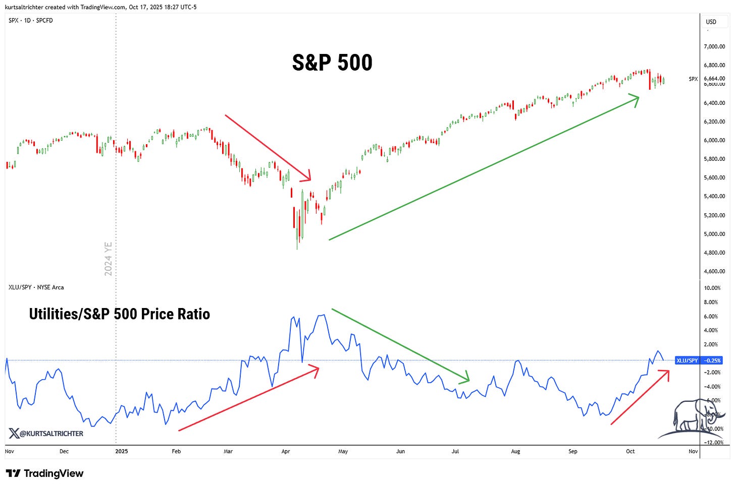 Gold outperforming is a warning sign on its own, but while most investors stay focused on tech, utilities have quietly taken the lead. That rotation matters because utilities are the most bond-like sector in the equity market. When investors grow cautious, they rotate toward predictable cash flows and essential services like electricity and water, areas that remain stable regardless of the business cycle. This behavior reflects a classic risk-off move. Since stock prices often lead the economy, utilities outperforming the broader market suggests traders are positioning for slower growth and tightening financial conditions ahead.