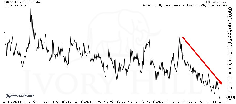 The MOVE Index, often called the “VIX for bonds,” tracks expected volatility in Treasury yields using options pricing. Since April, it has dropped by 50%, signaling a major positive shift for bonds. Lower volatility means less uncertainty about interest rates. Because bond prices move inversely to yields, stable or falling yields generally support higher bond prices. When the MOVE Index rises, it reflects unpredictable rate swings that make bonds riskier. When it falls, it indicates expectations for steadier or lower yields, improving the risk-reward profile and drawing investors back into fixed income.
