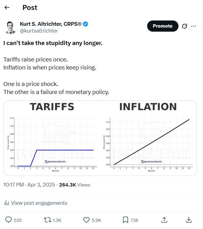 That last phrase is interesting to me. For the past year, both market gurus and the Fed have described tariffs as a persistent driver of inflation. Now the language has shifted. Powell acknowledged that CPI could spike temporarily but emphasized it would not last. The reason is simple: tariffs cause a one-time jump in prices, not ongoing, month-over-month inflation like we saw over the last 5 years. Because CPI measures the rate of change, not the price level itself, a one-time price shock fades mathematically over time, pushing inflation back down once prices stabilize.