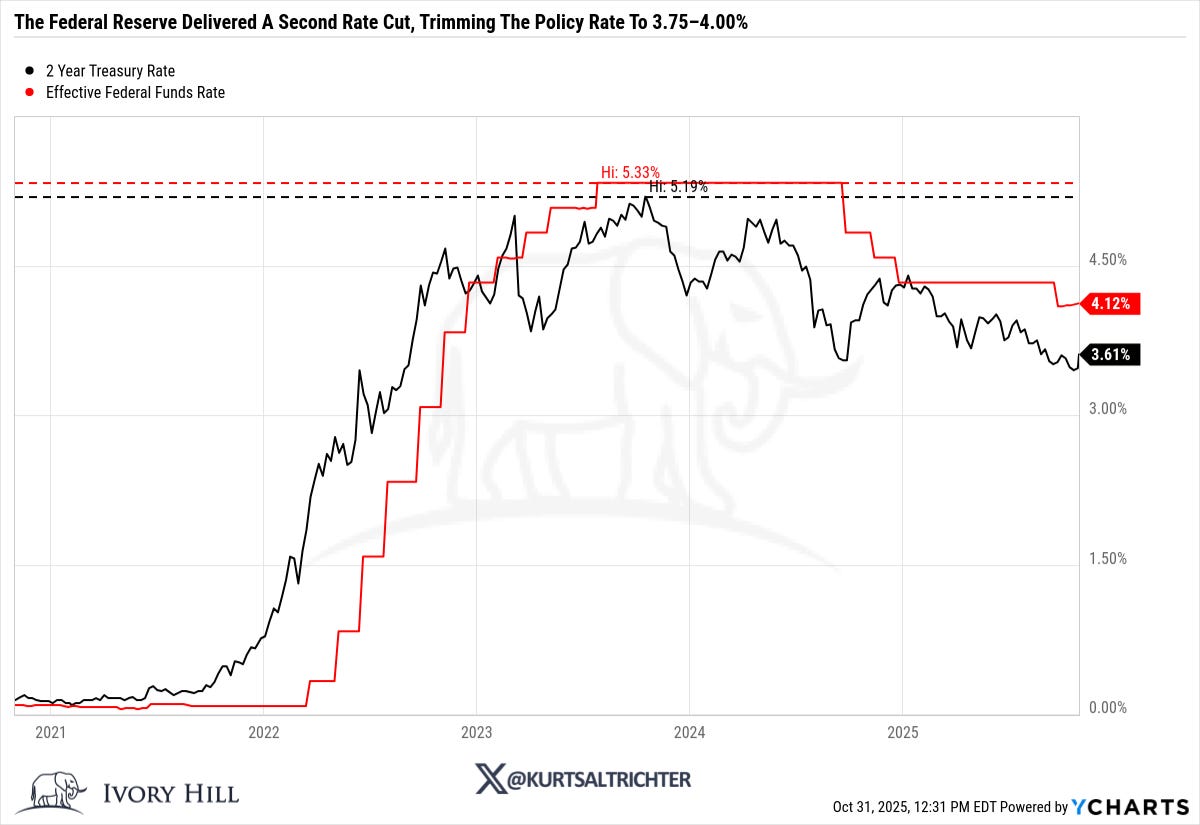 The Federal Reserve delivered a second consecutive rate cut, lowering the effective rate to 3.75%–4.00%. Jerome Powell signaled that a pause could follow at the next meeting, citing the federal data blackout caused by the government shutdown.