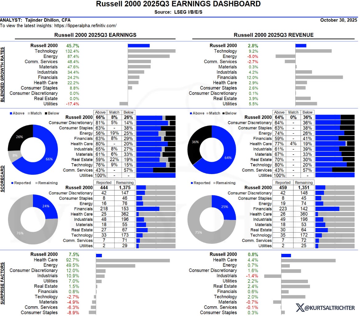 Small caps are showing real signs of life. Refinitiv’s latest data puts Russell 2000 earnings up +45.7% year-over-year, with 66% of companies beating estimates. That kind of acceleration hasn’t been seen since the post-pandemic rebound and signals a genuine profit recovery underway beneath the surface. Revenue growth of +2.8% means margins are expanding again, a sign of operating leverage returning to smaller businesses. For investors, this shift matters: earnings momentum drives valuation resets, and when small-cap EPS growth runs this strong, it often precedes a sustained period of outperformance versus large caps.