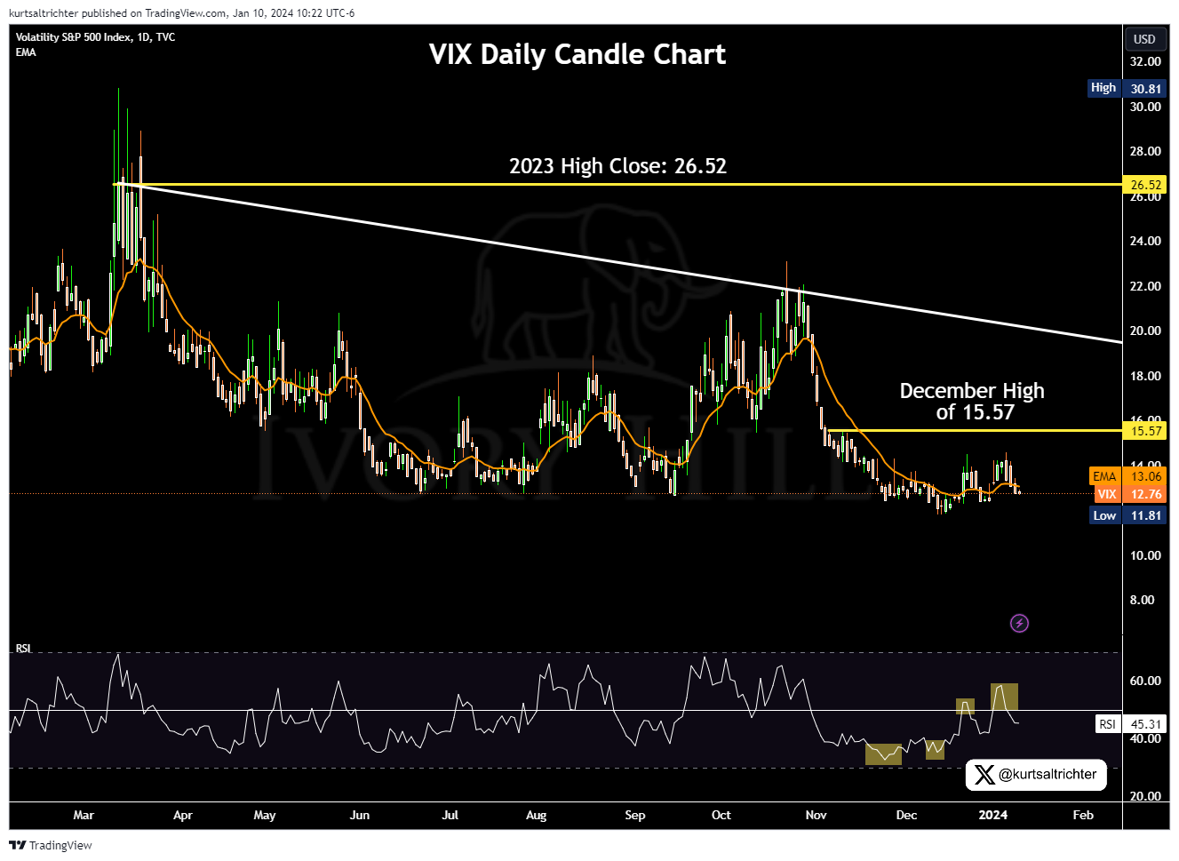 The VIX saw a significant start to the year, surging 17% last week from early-week lows before retreating below the crucial 14 level.