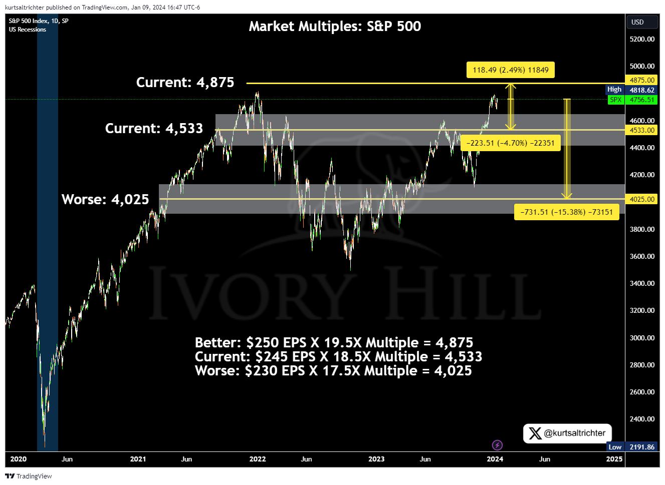 In this scenario, the very foundations of the Q4 rally would be undermined. This could lead to substantial declines in stock prices, and the possibility of giving back much of the gains seen from October to December would become a real concern. While it may seem unlikely given the strong investor confidence in the assumptions mentioned earlier, it's a scenario that should be taken seriously as it could become a reality if economic data takes an unexpected negative turn.