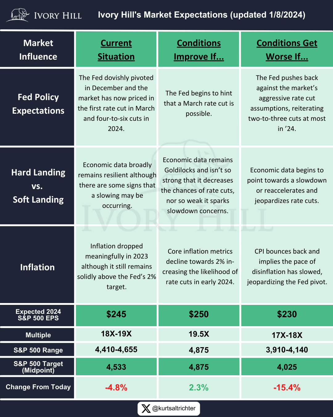 Markets started 2024 with the S&P 500 falling 1% while bubble-cap tech traded even worse, with the Nasdaq selling off more than 3% last week. Importantly, this decline wasn't triggered by any negative events but rather because the initial data points for 2024 didn't align with the aggressive and unrealistic expectations set for the year.
