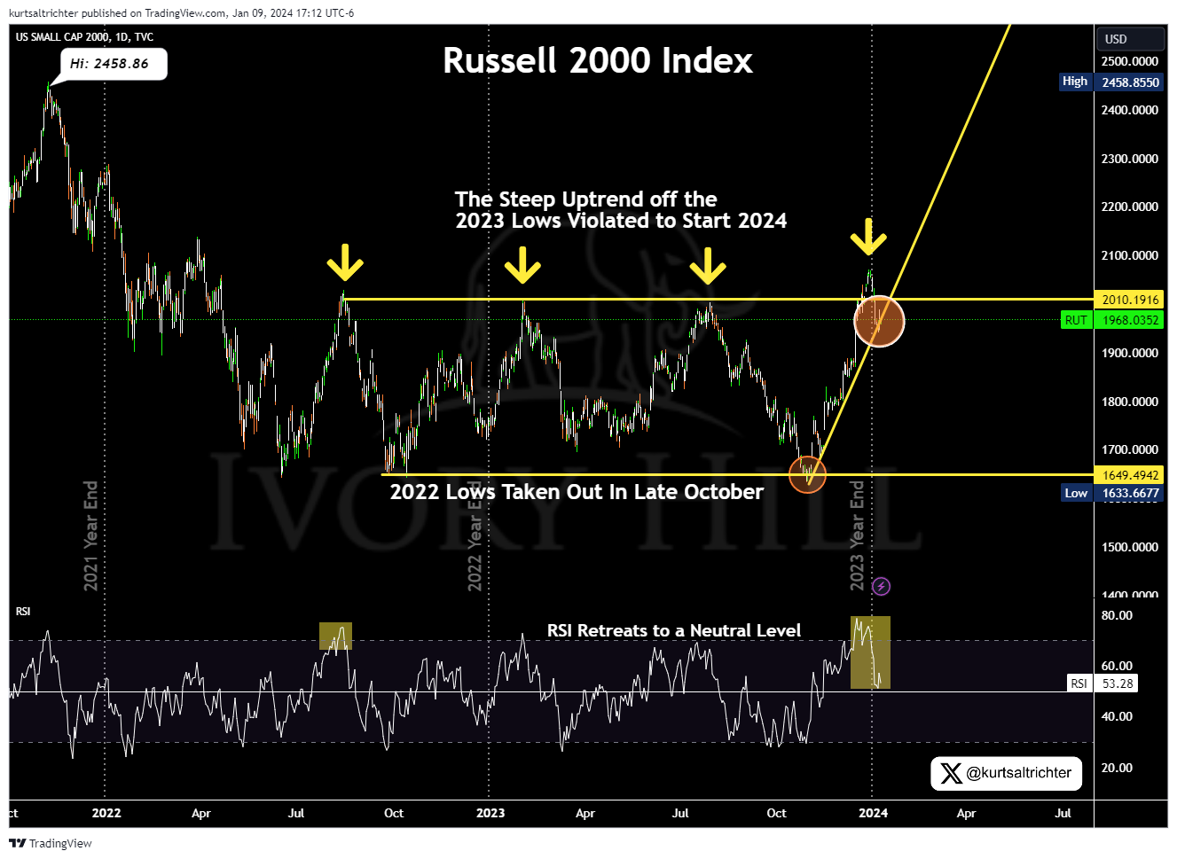 The small-cap Russell 2000 index experienced a significant pullback last week, breaking below the uptrend line that had been in place since the October lows.