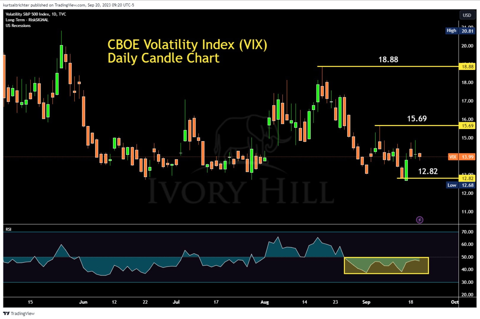 The market's commonly referred to "fear gauge," the VIX, dropped to levels last seen before the pandemic just last week. However, a significant reversal on Friday suggests that a short-term bottom might have been reached. Much like the S&P 500, the VIX is currently centered within a range as we approach the Federal Reserve's announcement. On the upside, if the VIX exceeds last week’s high of 15.69, it would indicate a mild increase in market uncertainty. A surpassing of the intraday high from August at 18.88, or a close above the previous month's high of 17.89, would be stronger indicators of potential increased market volatility and potential losses ahead.