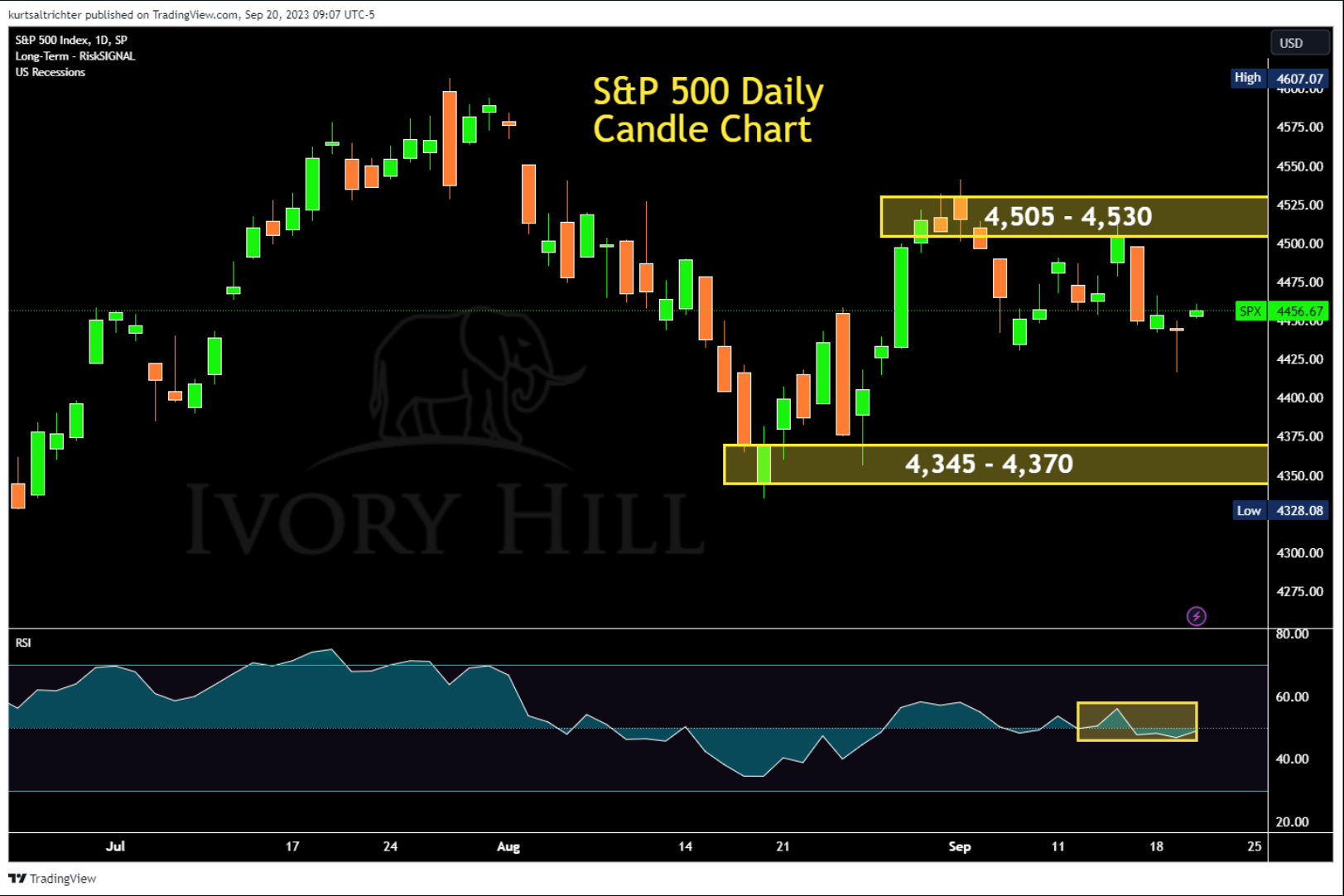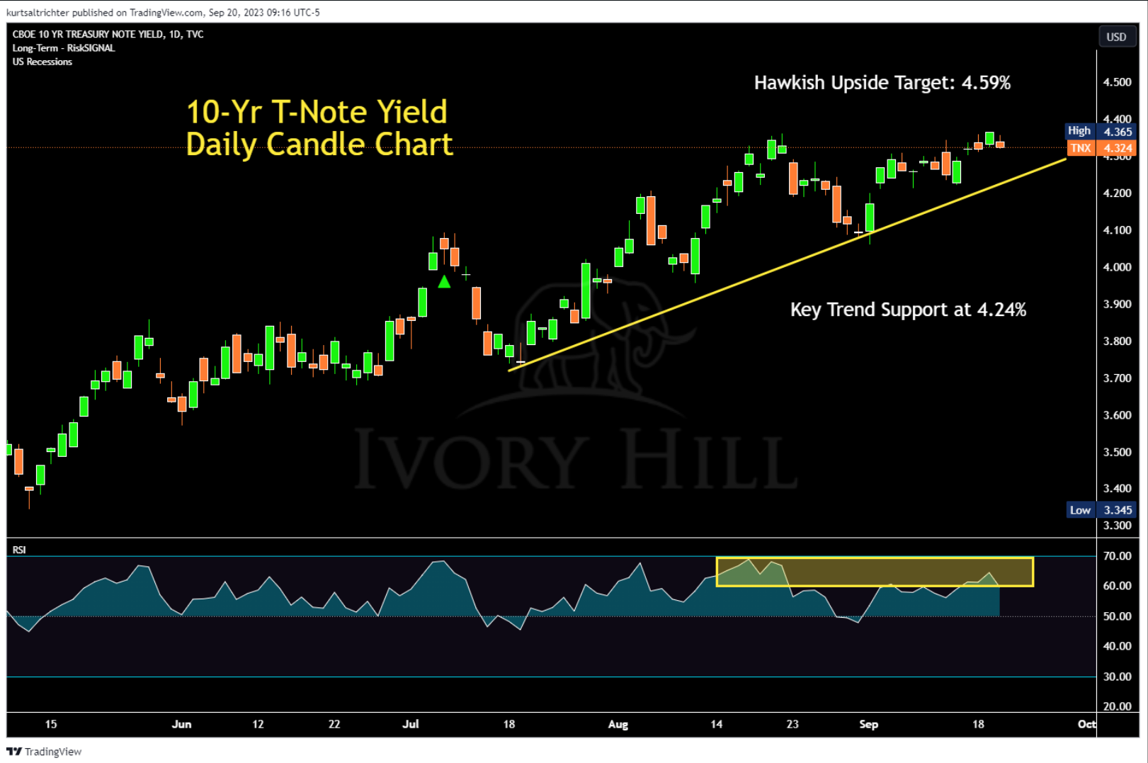 The 10-Year Treasury Note finished with a yield of 4.365%, the highest it's been since 2007. If the yield closes higher today, it will solidify the trend of increasing yields. The recent peak suggests a potential rise to 4.59%, which is a level to monitor if yields keep going up significantly. On the flip side, there's an established upward support at 4.24% from the lows of July. This means if the yields were to drop abruptly, they might stabilize or hesitate around this number.