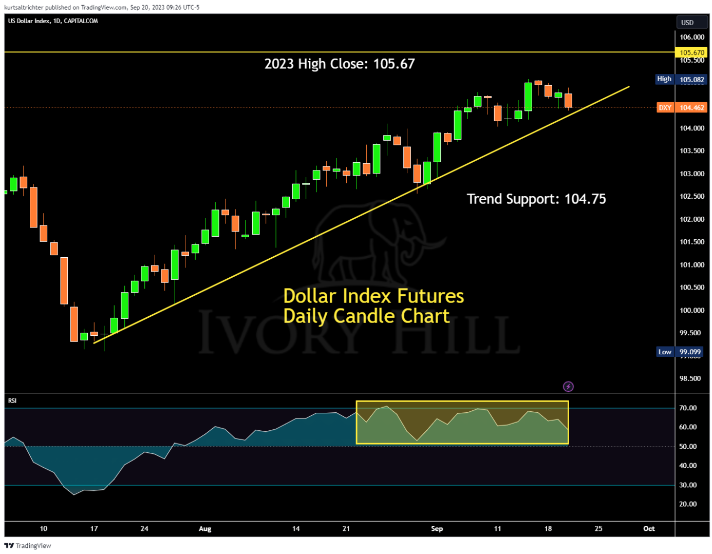 The Dollar Index has risen consistently with Treasury yields since reaching its bottom point this summer. For those bullish on the dollar in the long term, surpassing the 2023 high of 105.67 is crucial as it would solidify an upward primary trend. Meanwhile, there's a support trend at 104.75 that might stabilize the green back should it drop today. If it closes below this trendline, it could signal potential profit-taking, which might further push down the dollar in upcoming trading days.