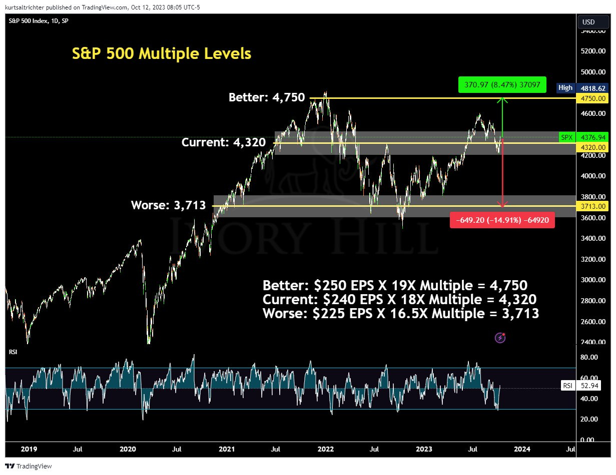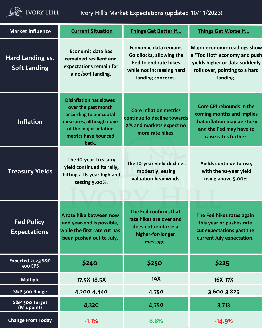 More precisely, in the table for September, it was outlined that with respect to the Federal Reserve's policy outlook, should the Fed maintain the prospect of a 2023 rate hike while delaying the anticipated timing of the initial rate cut to post-June 2024, it would adversely impact the markets. This note was confirmed during the September FOMC meeting when the Federal Reserve's projections indicated: