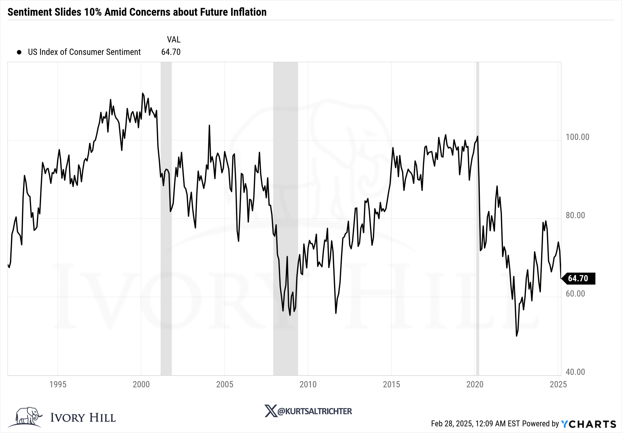 The sharp declines in consumer sentiment—University of Michigan's index dropping to 64.7 from 71.7 and the Conference Board’s confidence reading falling to 98.3 from 105.3—have fueled concerns that a pullback in consumer spending is imminent. Given that consumer spending drives U.S. economic growth, these sentiment surveys typically warrant attention. However, the current data should be taken with caution, as political polarization is distorting results.
