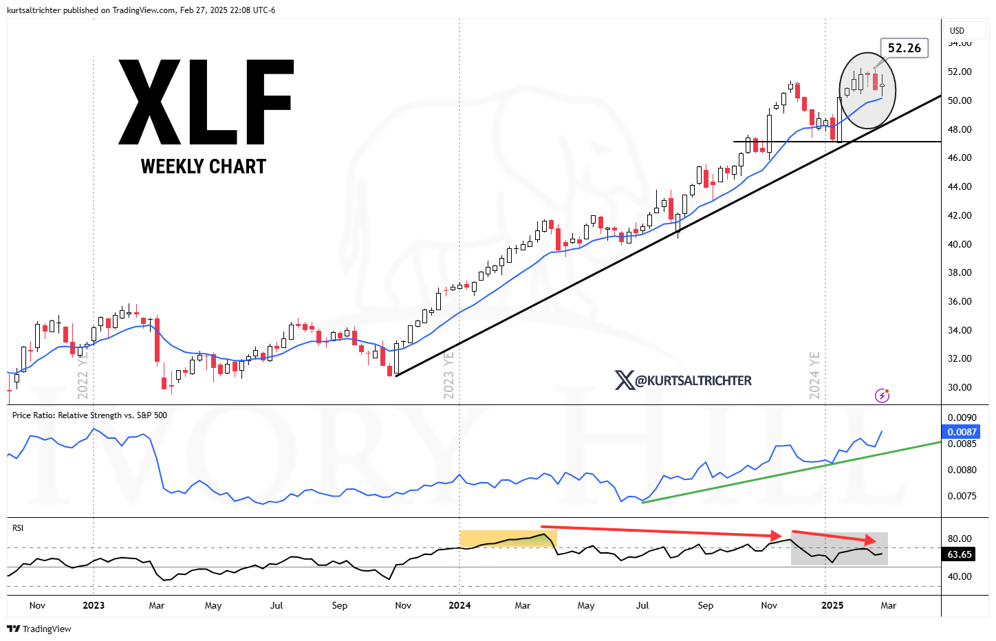 Financials (XLF) dropped 2.03% last week, forming a bearish outside-reversal on the weekly chart after an early-week breakout attempt failed. However, the ETF managed to hold above both its 2024 uptrend line and the 13-week moving average. The weekly RSI remains in bearish divergence but stays positive above 50, while its relative strength against the S&P 500 continues to trend upward.