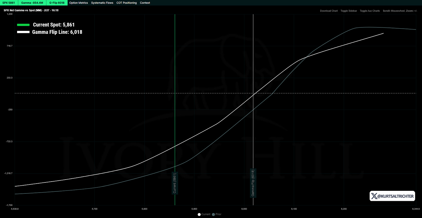 Market makers are in a short gamma position, which suggests elevated volatility ahead. In a negative gamma environment, option dealers adjust their hedges by selling futures as prices decline and buying futures as prices rise. These adjustments will amplify market movements, reinforcing volatility. We need the market to rally above 6,018 in order to get into a more favorable environment.