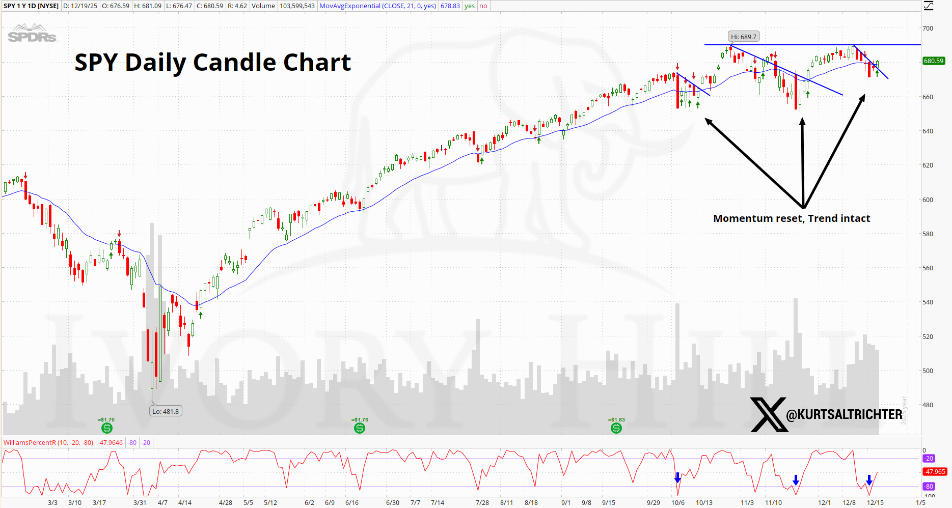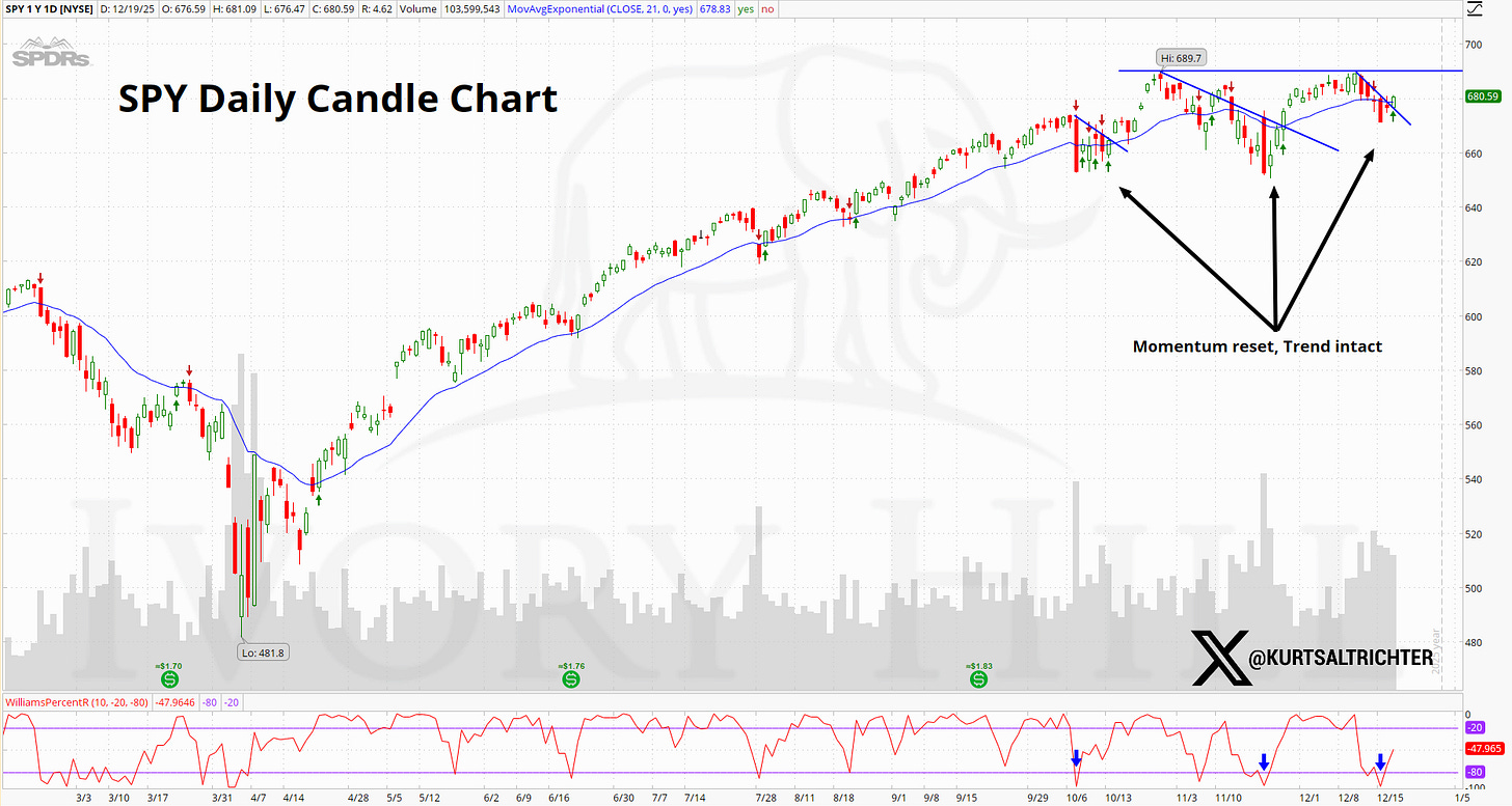 SPY worked off the late-November froth. The pullback reset Williams %R, which tracks how extended the price is within its recent trading range, shows that while price held trend support, the indicator rolled from the top of its range down toward the lower band, indicating momentum cooled without meaningful price damage. Moves that come after that kind of reset usually have more room to run, keeping fresh highs in play into year-end.