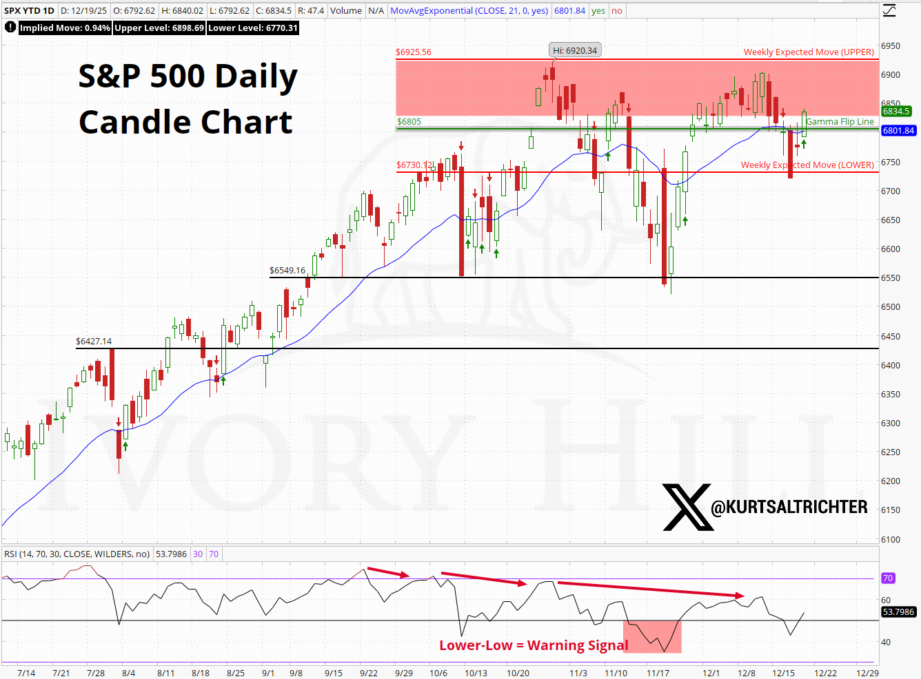 On the upside, SPX needs a clean daily close above 6,920. That would clear the ceiling that has been rejected since October and reopen upside into year-end. That is the Santa path.