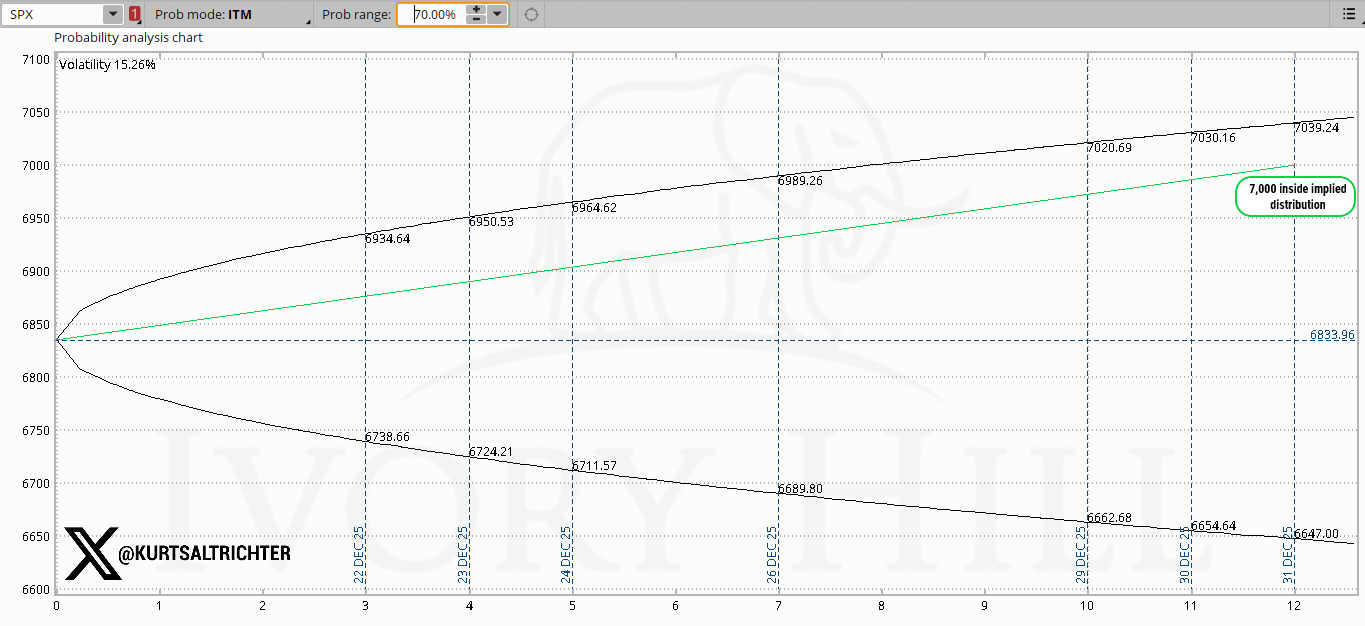 With the range set near 70%, SPX finishes inside the cone about two-thirds of the time under “normal” market conditions, assuming volatility stays contained. The horizontal black line marks the latest close level. The green line shows that a steady grind higher can reach 7,000 without leaving the implied distribution.